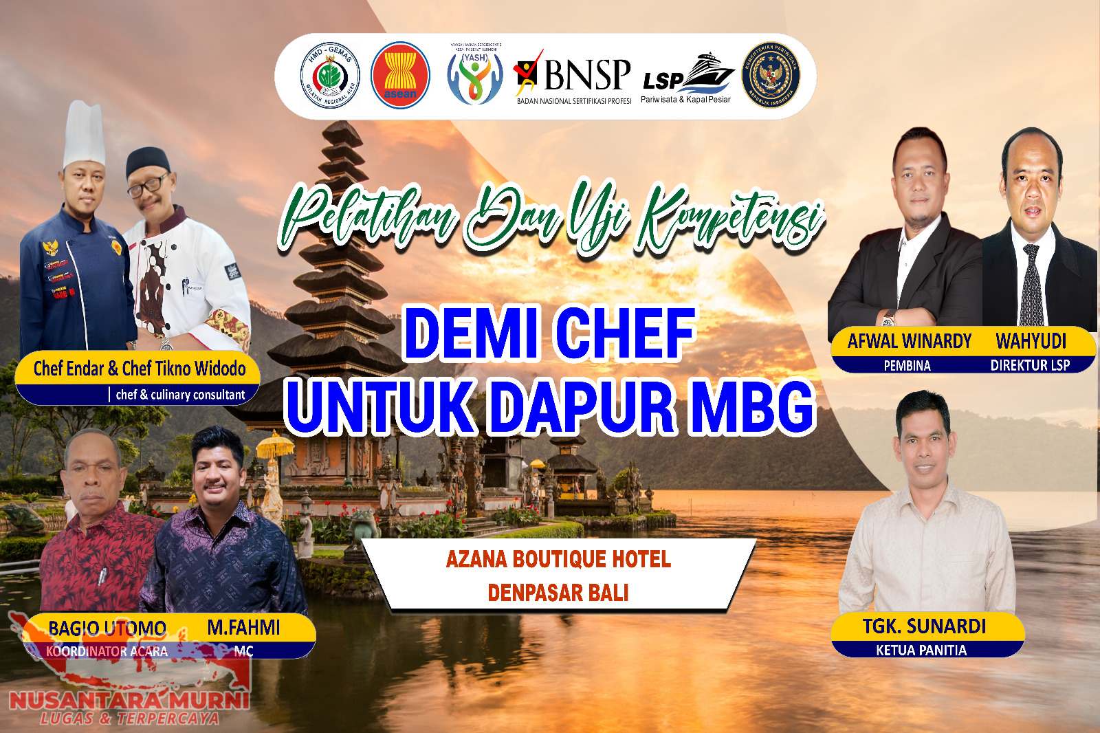 DENPASAR,NUSANTARAMURNI.com– Dalam upaya mendukung visi besar pemerintah mewujudkan generasi emas yang cerdas dan sehat, sebuah agenda krusial bagi tenaga profesional kuliner digelar di Bali. Pelatihan dan Uji Kompetensi DEMI Chef untuk Dapur Makan Bergizi Gratis (MBG) dilaksanakan pada Sabtu (07/02/2026) di Azana Boutique Hotel, Denpasar.