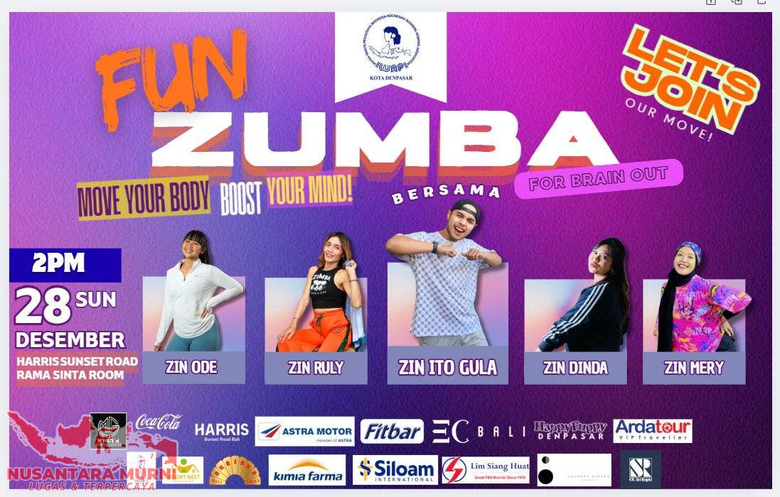 Denpasar,NUSANTARAMURNI.com- Menutup akhir tahun 2025 Ikatan Wanita Pengusaha Indonesia (IWAPI) Kota Denpasar menggelar “Fun Zumba For Brain Out” bersama Zin Ito Gula, Zin Ode, Zin Ruly, Zin Dinda, Zin Mery dan Instruktur Brain Out Ida Ayu Mahatma Tuningrat pada Minggu (28/12) di Convention Hall Haris Sunset Lt 2 Room Rama Sinta.