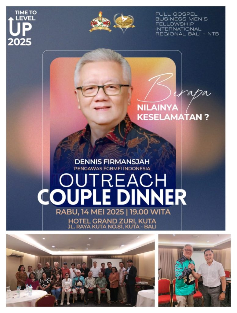 BALI,NUSANTARAMURNI.com- Suasana penuh kehangatan dan harapan mewarnai acara outreach couple dinner yang diselenggarakan oleh Full Gospel Business Men’s Fellowship International (FGBMFI) pada Rabu malam (14/05/2025). Acara yang berlangsung di Hotel Grand Zuri, Mangupura, Bali, mulai pukul 19.00 WITA ini dihadiri oleh sejumlah anggota FGBMFI Barito Chapter.