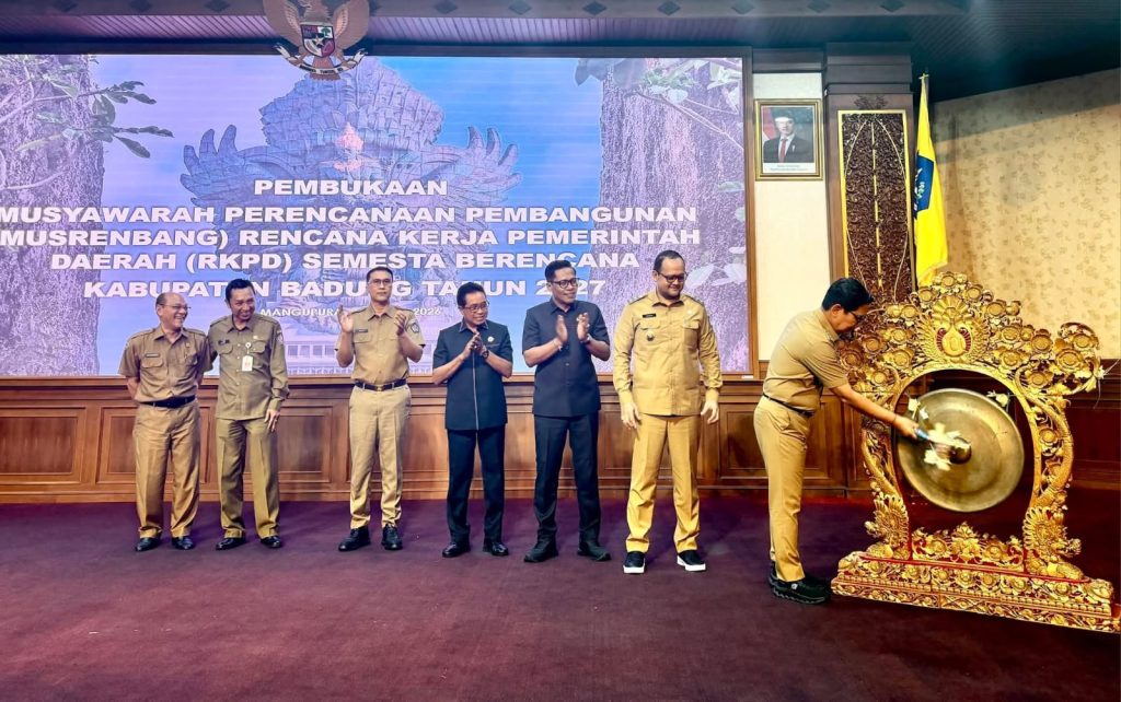 BADUNG,NUSANTARAMURNI.com- Pemerintah Kabupaten Badung bersama DPRD Badung resmi membuka Musyawarah Perencanaan Pembangunan (Musrenbang) Rencana Kerja Pemerintah Daerah (RKPD) Semesta Berencana Kabupaten Badung Tahun 2027. Kegiatan ini dibuka langsung oleh Wakil Ketua III DPRD Badung I Made Sunarta bersama Bupati Badung I Wayan Adi Arnawa, didampingi Wakil Bupati Badung Bagus Alit Sucipta, yang ditandai dengan pemukulan gong di Ruang Pertemuan Kertha Gosana, Pusat Pemerintahan (Puspem) Badung, Senin (30/03/2026).