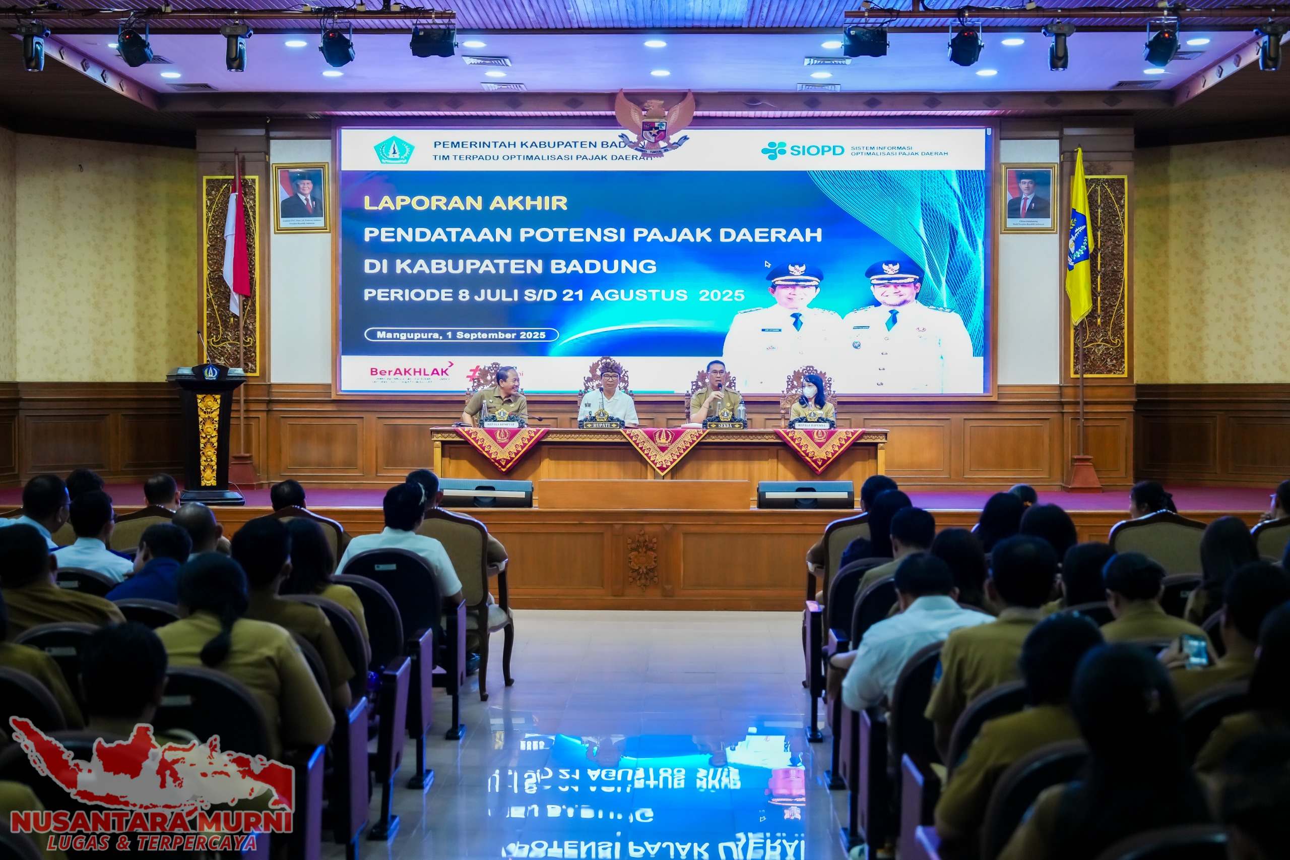 Badung,NUSANTARAMURNI.com-Pemkab. Badung melaksanakan rapat finalisasi laporan akhir pendataan potensi pajak daerah di ruang Kertha Gosana, Puspem Badung, Senin (1/9). Rapat dipimpin langsung Bupati Badung I Wayan Adi Arnawa didampingi Sekda Badung IB Surya Suamba selaku Ketua Tim Terpadu Optimalisasi Pajak Daerah (TOPD) dan diikuti Kadis Penanaman Modal dan Pelayanan Terpadu Satu Pintu (PMPTSP) I Made Agus Aryawan selaku Sekretaris I Tim TOPD, Kepala Bapenda Ni Putu Sukarini selaku Sekretaris II Tim TOPD, dari Kejari Badung sebagai anggota Tim serta Petugas Pendataan dari Perangkat Daerah dan Tim Teknis Sistem Informasi Optimalisasi Pajak Daerah (SIOPD).