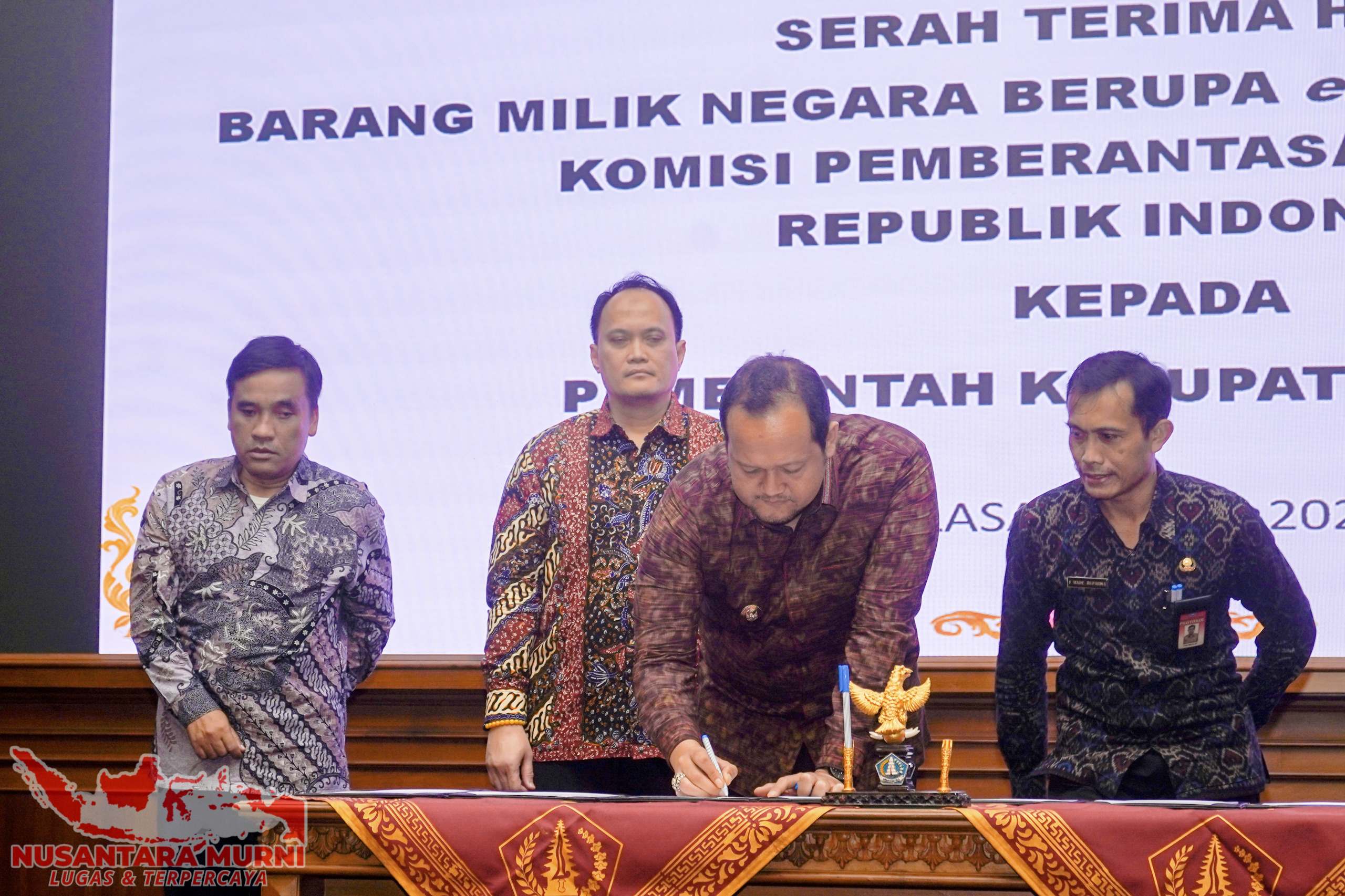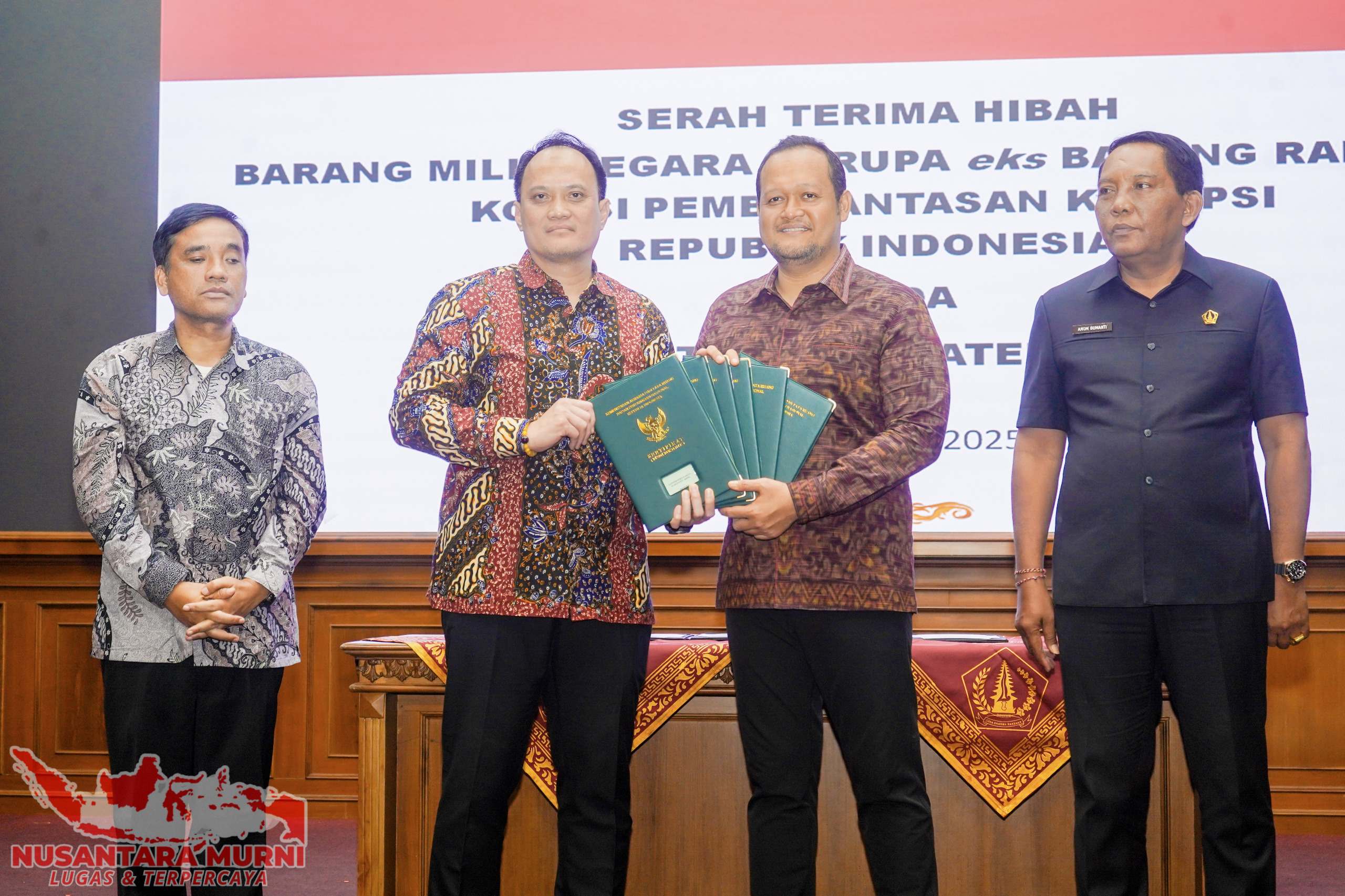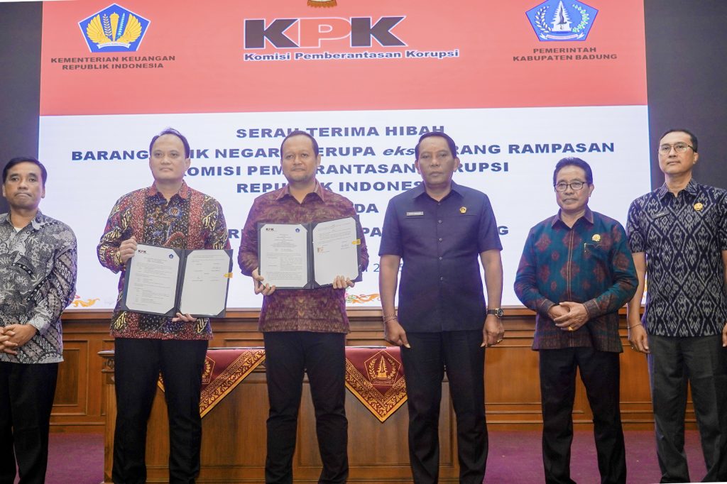 Badung,NUSANTARAMURNI.com-Pemkab. Badung menerima hibah Barang Milik Negara (BMN) berupa eks barang rampasan dari Komisi Pemberantasan Korupsi Republik Indonesia (KPK RI). Hibah berupa tanah barang sitaan KPK RI ini terletak di Kelurahan Kerobokan Kelod, Kecamatan Kuta Utara, terdiri dari 6 (enam) bidang tanah dengan total nilai Rp 26 miliar lebih. Acara serah terima hibah BMN, dirangkaikan dengan Sosialisasi Anti Korupsi di Ruang Kertha Gosana, Puspem Badung, Selasa (15/7). Hibah BMN diserahkan oleh Direktur Pelacakan Aset, Pengelolaan Barang Bukti dan Eksekusi (Labuksi) KPK RI Mungki Hadipratikto, diterima Wakil Bupati Badung Bagus Alit Sucipta. Hadir Ketua DPRD Badung I Gusti Anom Gumanti, Wakil Ketua DPRD I Made Sunarta, Forkopimda Badung, Sekda Badung IB. Surya Suamba beserta Pimpinan Perangkat Daerah, Kepala Satgas Eksekusi pada Direktorat Labuksi KPK RI Leo Sukoto Manalu beserta Tim KPK RI, Camat, Perbekel, Lurah dan Bendesa Adat se-Badung serta Kepala Lingkungan se-Kuta Utara.